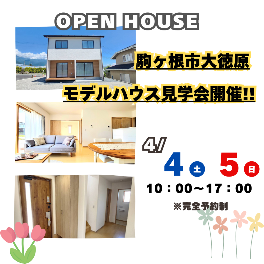 上伊那エリア 上伊那2026年4月4日(土)・5日(日)駒ヶ根市大徳原モデルハウス見学会2026年4月4日(土)・5日(日)駒ヶ根市大徳原14-2257…続きを読む上伊那2026年4月18日(土)19日(日)駒ヶ根市大徳原モデルハウス見学会2026年4月18日(土)19日(日)駒ヶ根市大徳原14-2257…続きを読む 飯田・下伊那エリア 飯田・下伊那2026年3月28日(土)・29日(日)高森町お客様邸完成見学会2026年3月28日(土)・29日(日)場所等の詳細はご予約時にお伝え致します…続きを読む 店舗来店はこちら! イベント情報一覧を見る